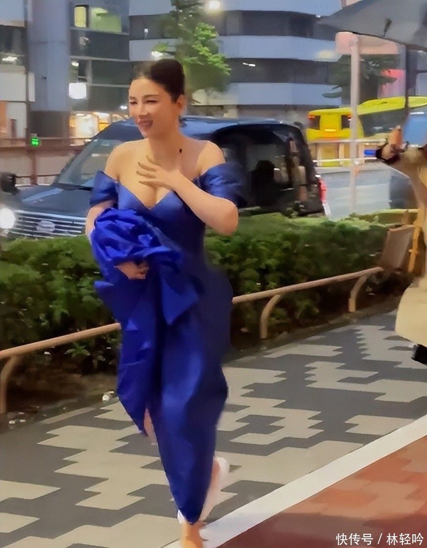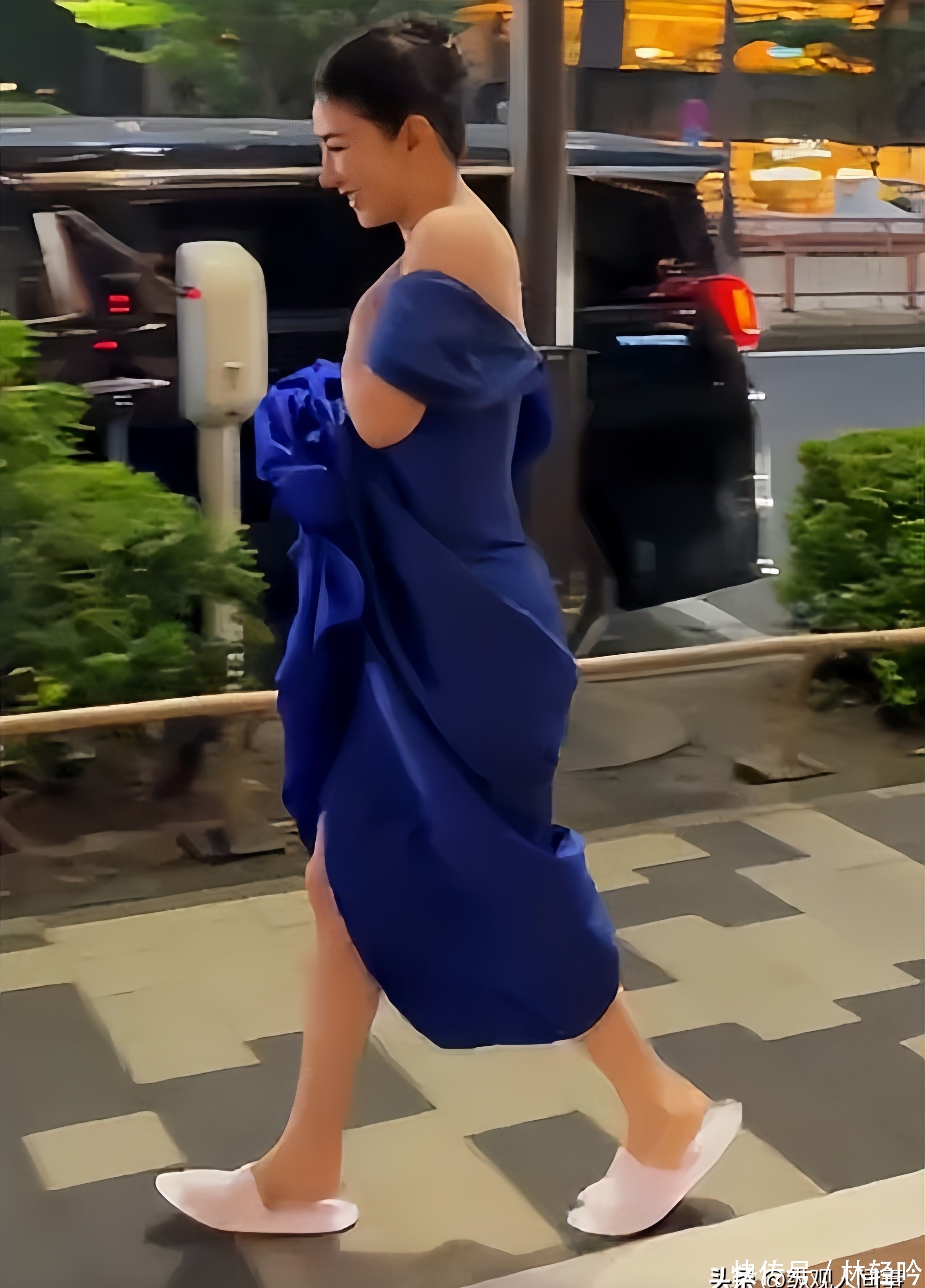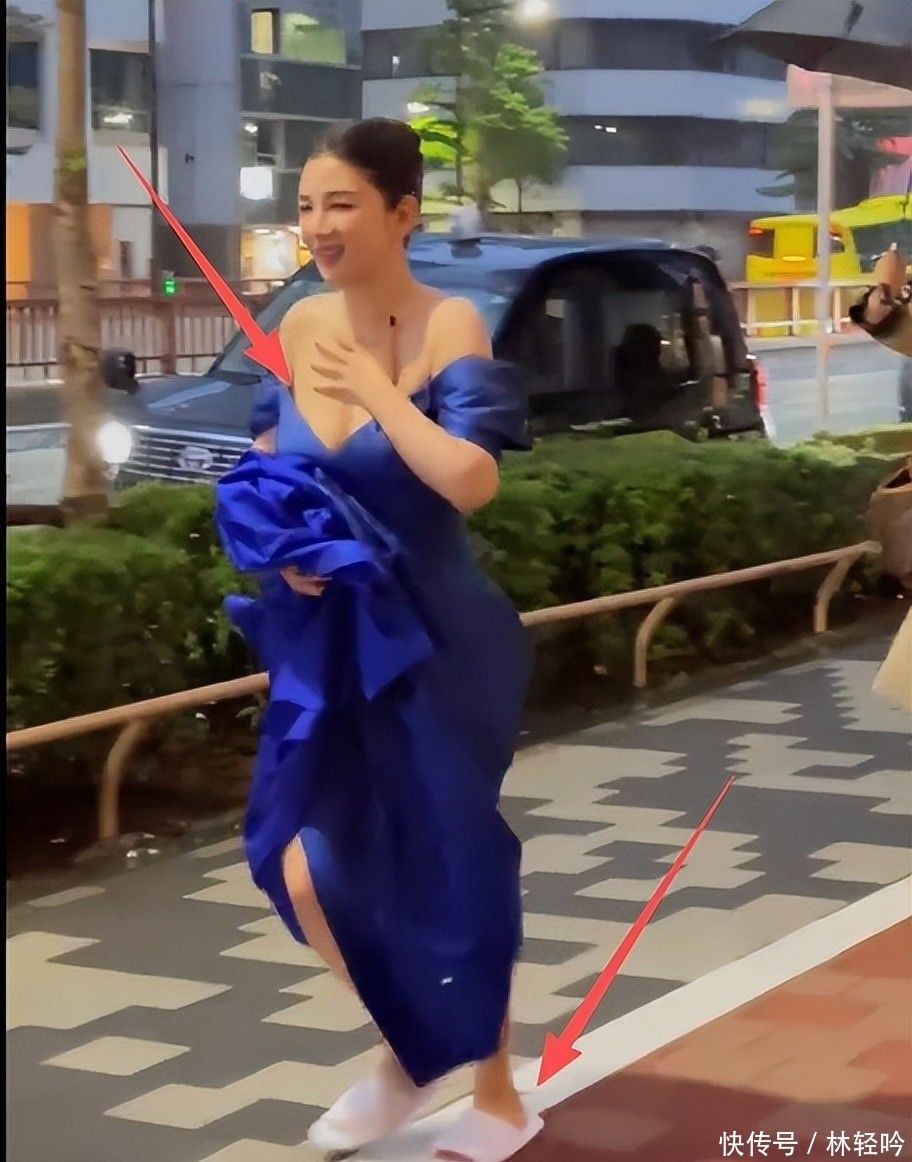 她身穿剪裁前卫的深V礼服,胸前大面积裸露几近半球,脚下却踩着酒店标配的一次性棉布拖鞋,在人流中疾步穿行,与银幕中温婉端庄的气质形成巨大反差。